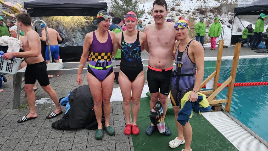 Mit am Start war auch eine Familie aus der Region: Heidelinde Partheymüller, ihre Töchter Franziska und Fiona sowie deren Partner Johannes Dietrich gingen über unterschiedliche Distanzen an den Start. Dabei startete Fiona zum ersten Mal über 100m Brust und schaffte die längere Strecke bei der Kälte sehr gut. Auch für Heidelinde waren die 50m Rücken eine neue Erfahrung, besonders, da es ins Gesicht schneite. Zum Abschluss absolvierten alle gemeinsam eine Familienstaffel. Die längsten Einzelstrecken betrugen 100 Meter.